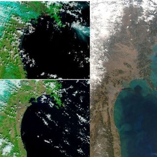 Ambas imágenes muestran el litoral oriental de Japón y sobre todo la región de Sendai, el epicentro de la tragedia humana tras el terremoto, con la diferencia de que una fue tomada el 26 de febrero y la segunda este sábado.