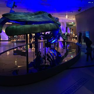 El esqueleto completo de una ballena azul ocupa la gran sala de exhibiciones, la cual está iluminada de diversas tonalidades de azul para recrear el ambiente marino.