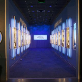 En una sala escasamente iluminada se exhibe en posición vertical una sección de casi 4 metros (12 pies) de un panel del Challenger con los marcos calcinados de las ventanillas a nivel de la vista del público.