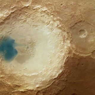 En la parte izquierda de la foto domina un gran cráter de unos 70 kilómetros de diámetro, que todavía conserva paredes escarpadas y una mancha de color azul, un depósito de polvo volcánico oscuro, rico en basalto, acumulado por el viento a lo largo de los años.