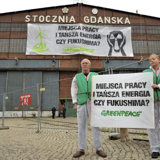 Greenpeace desplegaron hoy una gran pancarta en los astilleros de Gdansk, en el norte de Polonia, con el lema "¿Empleo y energía más barata o Fukushima?", un mensaje con el que la organización ecologista instó a Varsovia a abandonar sus planes nucleares y apostar por la energía eólica.