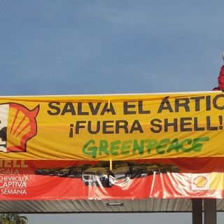 Los activistas, algunos caracterizados como osos polares, llegaron en seis botes neumáticos de la entidad, abordaron las instalaciones y escalaron una torre de 15 metros de altura para desplegar la leyenda "Ayudanos a detener a Shell".