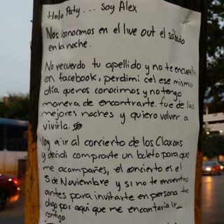 CIUDAD DE MÉXICO (04/OCT/2016).- Un joven llamado Alex conmocionó a las redes sociales tras pegar un cartel con un mensaje para “Paty”, una chica que supuestamente conoció el sábado pasado y que ahora busca incansablemente en Monterrey, Nuevo León.