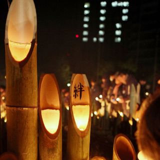 Miles de velas de bambú fueron colocadas para formar la fecha ''1-17'' en el parque de Higashi Yuenchi, donde se sitúa un monumento conmemorativo