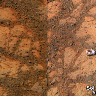 El científico jefe Steve Squyres tiene una hipótesis. En una presentación la semana pasada, dijo que probablemente una de las ruedas de Opportunity pateó la roca, que luego se deslizó hasta su campo de visión.