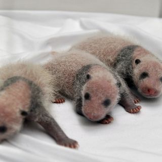 Imágenes entregadas a principios de mes muestran a tres pandas, con pelaje rosa, los ojos cerrados en su incubadora, bajo una espesa manta blanca.