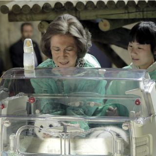 Doña Sofía, que es una gran amante de los animales, especialmente de los osos panda, ha visitado por primera vez a los pequeños oseznos, a los que ha cogido, besado y acariciado durante un buen rato, ante la atenta mirada de sus veterinarios, mientras que le explicaban los cuidados que reciben.