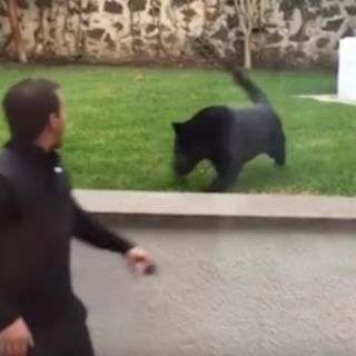 GUADALAJARA, JALISCO (08/JUN/2016).- Eduardo Serio, fundador del refugio Black Jaguar-White Tiger mostró en su cuenta de Facebook un video que muestra a un macho de pantera negra llamado ''Kalelito (Kal El)'' tomando una posición de ataque para sorprender a su cuidador, pero con una conclusión inesperada.