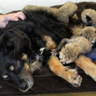 Perro 'niñero' acompaña a guepardos recién nacidos