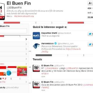 Las cuentas oficiales del programa el Buen Fin ofrecen a su comunidad las promociones de las empresas afiliadas. Así, en Twitter, por medio de retuits, el usuario puede enterar a sus seguidores de los descuentos o facilidades de pago disponibles desde hoy y hasta el lunes 19. Puede seguirlos en la cuenta: @ElBuenFin.