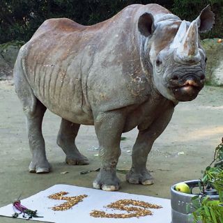 rinoceronte negra de mayor edad en Norteamérica con un pastel especial de copos de avena y melaza.