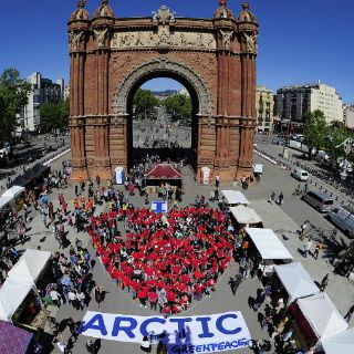 MADRID, ESPAÑA (20/ABR/2013).- Militantes de Greenpeace formaron el martes un corazón al pie del Arco de Triunfo en Barcelona (noreste de España), para pedir que se declare el Ártico como santuario mundial virgen de perforaciones petroleras y de pesca industrial.
