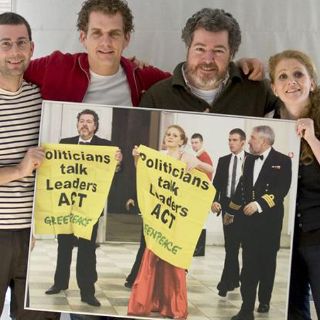 A la entrada del banquete desplegaron una pancarta delante de las cámaras de la televisión pública danesa DR con el lema "Los políticos hablan, los líderes actúan".