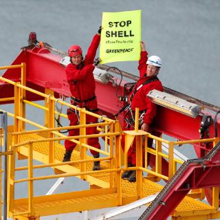 Greenpeace informó de que los activistas escalaron la torre de perforación de 53 metros del barco Noble Discover, donde desplegaron pancartas en los que se leía "Detengan a Shell" y "Salven el Ártico".