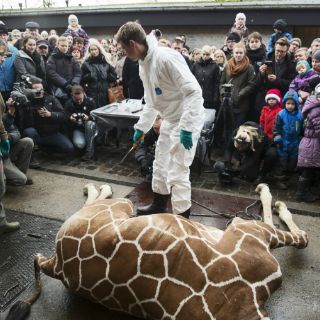 La jirafa Marius, un macho, fue sacrificada con una pistola neumática. Algunos visitantes, entre ellos niños, fueron invitados a ver mientras la jirafa era destazada y su carne arrojada a los leones.