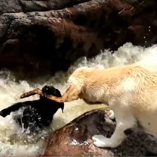 Otro labrador que observa la escena, al darse cuenta de las dificultades que enfrenta su compañero, decide acercarse y sujeta con su hocico el palo que el otro perro no había soltado; aferrándose a él, el animal es jalado por el otro y tras unos esfuerzos logra ponerse de patas sobre la superficie. El hecho es celebrado por la persona que graba el momento.