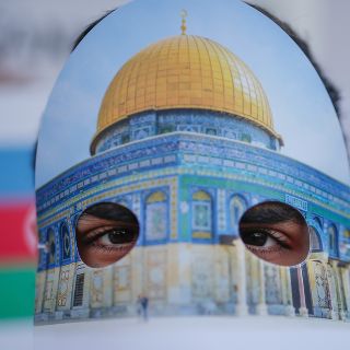 Un manifestante en Estambul, Turquía, porta una máscara con la imagen del Domo de Jerusalén, durante una protesta contra el presidente estadounidense Donald Trump. AP/E. Gurel