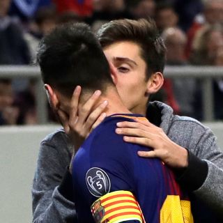 Un aficionado que invadió la cancha le da un beso a Lionel Messi, del Barcelona, durante el partido de Champions League ante el Olympiakos en Piraeus, Grecia. AP/T. Stavrakis
