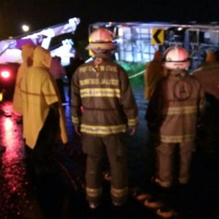 También precisó que el autobús, con placas 715659 G servicio público federal, volcó sobre su costado derecho, aparentemente por una falla mecánica que se conjugó con el piso mojado.