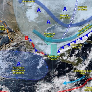La masa de aire ártico asociada al frente genera un evento de “Norte” de muy fuerte a intenso en el litoral del Golfo de México, el istmo y golfo de Tehuantepec y la península de Yucatán, con rachas que superan los 100 km/h y oleaje elevado. Además, se registra un descenso marcado de las temperaturas en gran parte del país, con heladas severas en regiones de la Mesa del Norte y la Mesa Central.