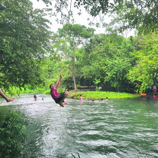El río es uno de los atractivos principales para los niños, pues cuenta con un muelle de donde los pequeños, aunque también se admiten adultos, se echan clavados, maromas y piruetas. Igualmente, de los árboles que arrojan su sombra sobre el agua, cuelgan un par de columpios para que la diversión siempre esté presente.