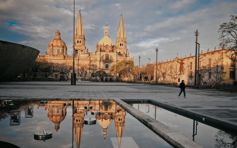 Plaza de la Liberación remodelada para el Mundial 2026. La intervención integral renovó su superficie, instalaciones eléctricas y redes de agua, amplió fuentes, incorporó jardineras, bancas y zona peatonal frente al Teatro Degollado. ESPECIAL