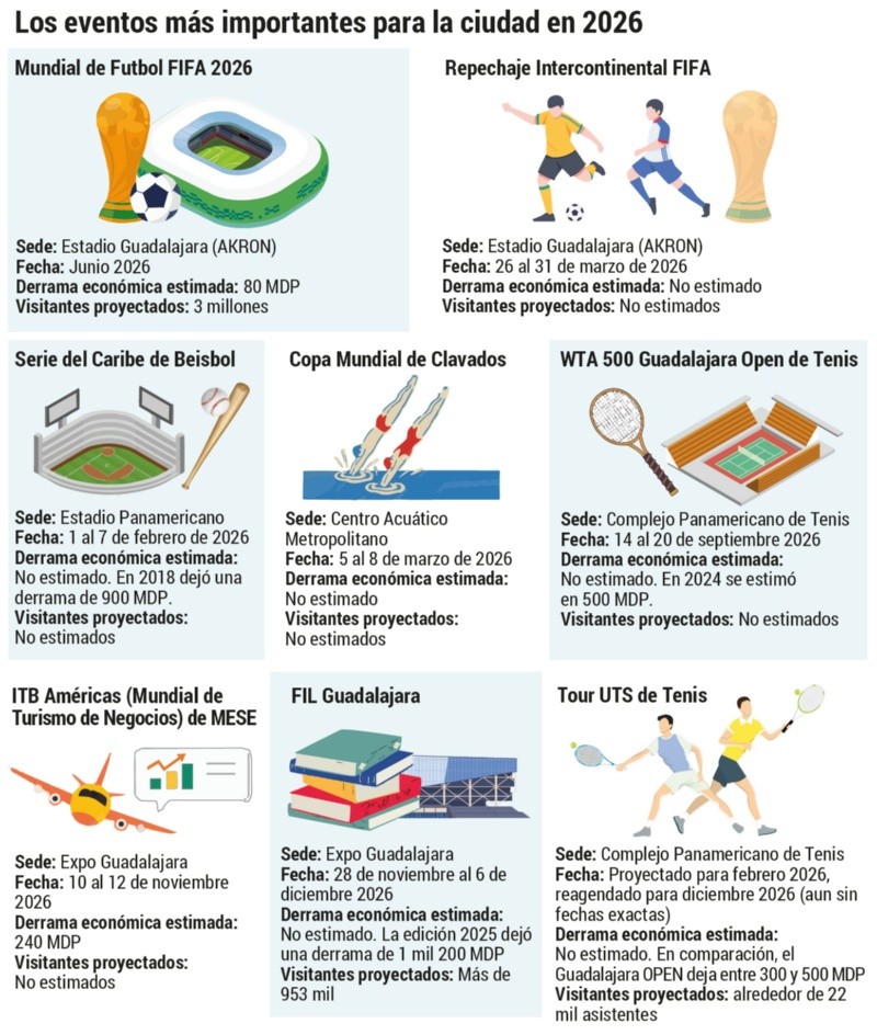 Este año es inmejorable en materia turística. La lista de grandes eventos es importante: Mundial de Futbol, Serie del Caribe de Beisbol, Copa Mundial de Clavados, WTA 500 Guadalajara Open de Tenis, ITB Américas (Mundial de Turismo de Negocios), Tour UTS de Tenis y FIL, así como todas las ferias y exposiciones de negocios en recintos como Expo Guadalajara, pero se suman nuevos centros de espectáculos.