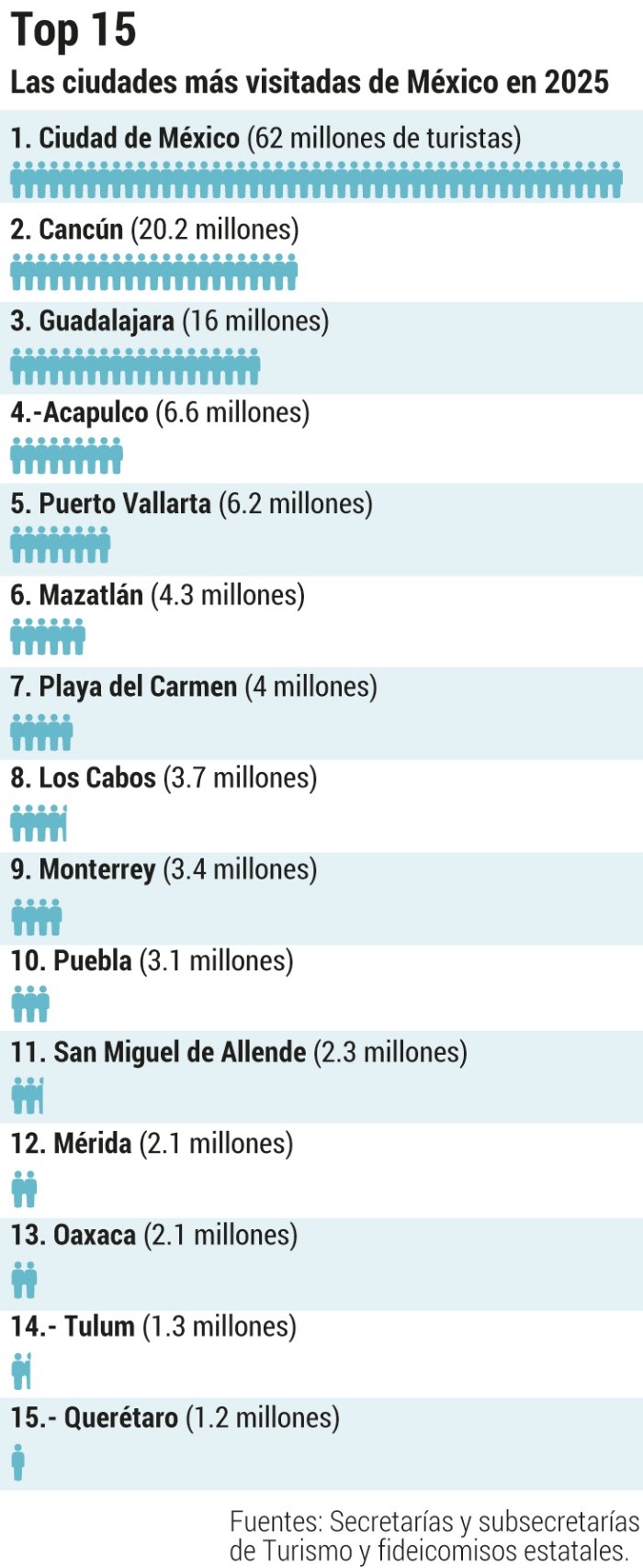 En el análisis turístico en México, Guadalajara se mantiene como una de las ciudades más visitadas, solo por debajo de la Ciudad de México y Cancún. A nivel estatal, destinos como Puerto Vallarta, Tequila, Tapalpa y Mazamitla destacan por su alta afluencia. Lo mismo pasa con los Pueblos Mágicos, sumándose San Sebastián del Oeste, Mazamitla, Lagos de Moreno y Tequila.