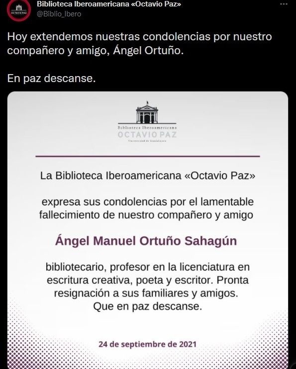 Este viernes el gremio literario mexicano recibió con pesar la noticia de la muerte de Ángel Ortuño (1969).El autor jalisciense deja un legado sólido legado de poesía, calificada como irreverente y divertida: “auténtico forajido de la lírica”, según el poeta José Homero, o “una de las voces más desenfadadas y arriesgadas de la poesía mexicana”, en palabras del narrador Luis Panini.Sus poemas aparecieron en publicaciones periódicas como Tierra Adentro, La Tempestad, Letras Libres, Cuadernos Salmón, entre muchas otras revistas. En formato de libro o plaquette publicó poemarios y antologías de su obra, con títulos como Mecanismos discretos, Aleta dorsal, El amor a los santos, 1331, Boa, Perlesía y Turbo Girl: historias de la mamá del diablo. Sus libros se encuentran en los catálogos de diversas editoriales (Mano Santa Editores, BongoBooks Ediciones, Arlequín, Ediciones El Viaje y la Dirección General de Publicaciones del Conaculta).Además de su labor como poeta, Ortuño trabajó buena parte de su vida como bibliotecario en la Biblioteca Iberoamericana Octavio Paz, en la que colaboró de manera cercana con Fernando del Paso (director de la misma) como responsable de los servicios de la biblioteca. La actual directora de la biblioteca, la poeta Carmen Villoro, rememoró a Ángel Ortuño al inicio de la segunda sesión del día en la Bienal Mario Vargas Llosa, en la que participó.jb