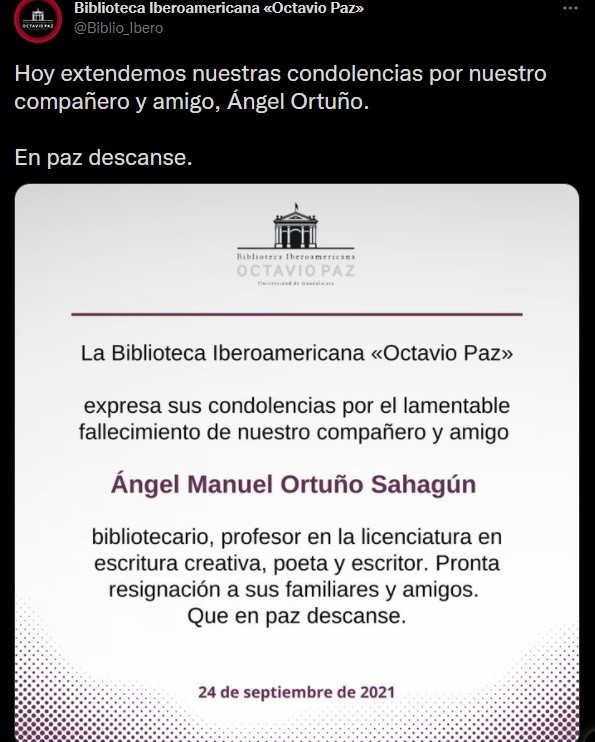 El poeta y bibliotecario Ángel Ortuño falleció este viernes, según informó la Biblioteca Iberoamericana "Octavio Paz" de la Universidad de Guadalajara (UdeG) sin especificar la causa del deceso. Ortuño trabajaba en la biblioteca desde 1997.“La Biblioteca Iberoamericana ´Octavio Paz´expresa sus condolencias por el lamentable fallecimiento de nuestro compañero y amigo, Ángel Manuel Ortuño Sahagún”, escribió en un breve comunicado. “Pronta resignación a sus familiares y amigos. Que en paz descanse”. También, el Centro Universitario de Ciencias Sociales y Humanidades (CUCSH) lamentó la partida del poeta, destacando su participación en la Cátedra Latinoameicana Julio Cortázar del Centro Universitario.Una de las últimas publicaciones de Ángel Ortuño fue hecha la mañana del jueves, donde informó que se había hecho unos estudios y debía descansar.Por su parte, Antonio Ortuño, hermano del poeta, compartió a través de Twitter la canción "El Rey del Rock n´Roll" de Vicentico con el siguiente mensaje: “Se fue el rey irrepetible de toda esta historia”.Además, la Feria Internacional del Libro en Guadalajara (FIL) se despidió "con muha tristeza" de su amigo poeta. " Nos enteramos con mucha tristeza de la repentina muerte de nuestro amigo Ángel Ortuño, generoso escritor mexicano, visitante y participante asiduo de la FIL Guadalajara. Nos unimos al dolor de su familia y sus seres queridos. Descansa en paz, poeta". El escritor jalisciense deja un legado sólido legado de poesía, calificada como irreverente y divertida: "auténtico forajido de la lírica", según el poeta José Homero, o "una de las voces más desenfadadas y arriesgadas de la poesía mexicana", en palabras del narrador Luis Panini.Además de su labor como poeta, Ortuño trabajó buena parte de su vida como bibliotecario en la Biblioteca Iberoamericana Octavio Paz, en la que colaboró de manera cercana con Fernando del Paso (director de la misma) como responsable de los servicios de la biblioteca.***Si te interesó esta noticia y quieres saber más, entonces descarga y descubre INFORMAPlus, la aplicación digital de EL INFORMADOR, en donde tenemos contenidos exclusivos, seleccionados por nuestros editores, para darles una experiencia más completa a los lectores.Descarga la aplicación y pruébala GRATIS por treinta días.Si eres suscriptor de EL INFORMADOR tu acceso está incluido, solicítalo al 33 3678-7777AC