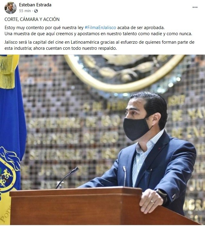 La Ley de Filmaciones de Jalisco, iniciatiativa impulsada por el diputado Esteban Estrada, #FilmaEnJalisco se aprobó este martes durante la sesión del pleno del Congreso, ley que convierte al Estado en la Capital del Cine en Latinoamérica."Una muestra de que aquí creemos y apostamos en nuestro talento como nadie y como nunca", escribió Estrada en sus redes. Con esta ley, Jalisco plantea posicionarse como capital del cine en América Latina al establecer herramientas y apoyos para que la industria cinematográfica, audiovisual y fotográfica refuerce e incremente sus producciones locales, se atraigan proyectos internacionales, haya impacto positivo en el turismo, y se generen empleos y derrama económica.A partir del siguiente día de su publicación en el Diario Oficial, la Ley de Filmaciones entraría en vigor entre esta y la próxima semana a más tardar, explicó Esteban Estrada, impulsor de la iniciativa que tiene como principal eje de trabajo brindar herramientas, apoyos y facilidades para los distintos engranes de la industria jalisciense y sus proyectos, además, de que se enfoca a Jalisco como un escenario ideal para filmar e incentivar la participación del talento local e internacional.jb
