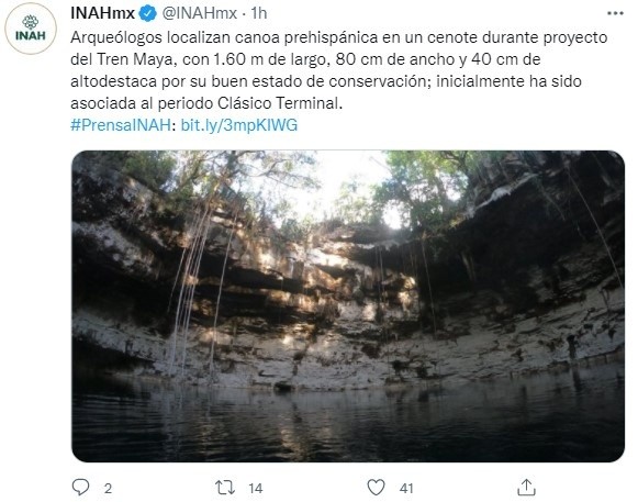 Especialistas del Instituto Nacional de Antropología e Historia (INAH) descubrieron una canoa maya prehispánica en buen estado de conservación, en un cenote de Izamal, Yucatán, que mide 1.60 m de largo, 80 cm de ancho y 40 cm de alto, y que por sus características estaría asociada al periodo Clásico Terminal (830-950 d.C.)El hallazgo se hizo durante las labores de salvamento arqueológico que se llevan a cabo debido a la construcción del Tren Maya –uno de los megaproyectos del actual gobierno–, en específico en el Tramo IV de la obra, que va de Izamal, Yucatán, a Cancún, Quintana Roo.En ese tramo las labores de salvamento están a cargo del arqueólogo Manuel Pérez Rivas y José Francisco Osorio León. Ahí se localizó el sitio denominado San Andrés, donde hay un cenote, un pozo y una rejoyada.Al explorar el cenote se encontró una marca una cueva y "dentro se observó inicialmente un tronco de madera dura, mismo que tras su inspección denotó la presencia de cortes simétricos realizados para la creación de una cubierta sin bordas, lo cual hizo evidente que se trataba de una canoa tipo plataforma. Con 1.60 metros de eslora (largo), 80 centímetros de manga (ancho) y 40 centímetros de puntal (alto), la pequeña embarcación podría haberse empleado para la extracción de agua del cenote o para el depósito de ofrendas durante rituales", dijo el INAH en comunicado.Helena Barba Meinecke, titular de la Oficina Península de Yucatán de la Subdirección de Arqueología Subacuática (SAS), indicó que "la relevancia radica en que es que es la primera canoa de este tipo que se encuentra completa y tan bien conservada en el área maya, habiendo también fragmentos de estas embarcaciones y remos en Quintana Roo, Guatemala y Belice".Inicialmente, indicó la especialista, el objeto está asociado al periodo Clásico Terminal (830-950 d.C.). Sin embargo, será en noviembre próximo cuando se realice una nueva prospección a la canoa, "a fin de precisar su antigüedad mediante dendrocronología, análisis que sumarán el apoyo de la Universidad La Sorbona, de París, así como conocer exactamente de qué árbol es la madera".También se realizará "un pozo de sondeo en el sedimento que hay bajo la canoa, a fin de definir la estratigrafía del entorno y posibles elementos adicionales; lo mismo que estudios de fotogrametría para obtener un modelo 3D de la canoa, que ayude en su estudio y divulgación virtual y que facilite la creación de réplicas que puedan integrarse a museos de la región".Sin embargo, la canoa no ha sido el único hallazgo en San Andrés, pues en el pozo-cenote, a 50 metros de profundidad, se identificó una osamenta humana y cerámica, así como pintura mural en su área de acceso."En las paredes de la rejoyada, a través de intrincados pasajes, los investigadores de la SAS encontraron pintura mural –a manera de manos pintadas sobre el techo de roca–, un incensario completo tipo Cumtun Compuesto, correspondiente al periodo Posclásico Tardío (1200-1500 d. C.), una roca-estela, un cuchillo ritual y más de 40 vasijas 'matadas' (que fueron rotas adrede al ser colocadas en el lugar) con carbón asociado. Todos los elementos cerámicos y óseos descubiertos hasta el momento han sido registrados y fueron trasladados al campamento arqueológico de la Zona Arqueológica de Chichén Itzá, para su resguardo", detalló el INAH.Agregó que el sitio arqueológico de San Andrés ha quedado bajo la protección del INAH tanto en su parte terrestre como en la subacuática, ya que los investigadores también notaron evidencias de saqueos en el cenote.AF
