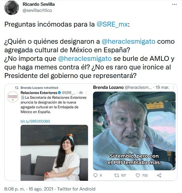 Funcionarios y seguidores del Presidente Andrés Manuel López Obrador criticaron el nombramiento de la escritora y feminista Brenda Lozano, quien ayer lunes fue designada por la Secretaría de Relaciones Exteriores, a cargo del canciller Marcelo Ebrard, como la nueva agregada cultural de la Embajada de México en España.Lozano, quien sucede al autor Jorge F. Hernández tras su polémica dimisión entre acusaciones de misoginia y choques con el Gobierno, fue acusada en redes sociales de haber emitido críticas en el pasado contra López Obrador.La escritora está en la polémica y es tendencia en Twitter porque seguidores y funcionarios de la 4T han reproducido algunas de las críticas que hizo contra la administración y el Mandatario, en el pasado, en su cuenta personal.Pedro Salmerón, director del Museo Regional de Guadalajara, publicó esta mañana un hilo en Twitter donde cuestiona la decisión de Ebrard y del director de Diplomacia Cultural, Enrique Márquez, al designar a Brenda Lozano, a quien califica de integrante de "las mafias de escritores".Salmerón señala: "Y es que de verdad, no puede menos que indignarnos que se designe para un cargo tan representativo, a alguien que ha insultado soez y sistemáticamente al nuevo gobierno, a su titular, a su esposa, como ha hecho @heraclesmigato (Brenda Lozano), como lo muestra en un nutrido hilo @sevillacritico".Seguidores de AMLO consideraron un "error garrafal" del canciller haber nombrado agregada cultural a una "antiobradorista" y cuestionaron la congruencia de Brenda Lozano por haber aceptado el encargo. Incluso compartieron memes publicados por la escritora y presionaron para que renuncie a través del "hashtag" "#RenunciaBrendaLozano".Algunos echaron a andar consultas: "¿Cree que Brenda Lozano merece que le regalen un cargo como agregada cultural en España después de burlarse varias veces del Presidente López Obrador? Sí, merece el regalo. No lo merece".También hay comentarios de apoyo a Brenda Lozano por su designación, la escritora Sandra Lorenzano escribió: "¡Felicidades, querida @heraclesmigato!! ¡Qué orgullo!", Pablo Rendón escribe: "Ojalá tanta polémica gratuita alrededor del nombramiento de Brenda Lozano como agregada cultural en España sirva, también, para que su obra llegue a más lectores. Una de las voces más interesantes dentro de la nueva narrativa mexicana, sin duda. Lo demás es puro ruido".En tanto, León Krauze dijo: "Hace muchos (demasiados) años, tuve el privilegio de que @heraclesmigato fuera mi alumna en un taller de revistas. Inteligente, sensible, creativa... ¡Qué suerte tiene la Embajada de México en España! Felicidades, Brenda." Y la actriz Claudia Ramírez, dijo: "Hacen TT a Brenda Lozano porque no piensa como ellos, los retrógradas, tan evidentes como siempre… felicidades". Si te interesó esta noticia y quieres saber más, entonces descarga y descubre INFORMAPlus, la aplicación digital de EL INFORMADOR, en donde tenemos contenidos exclusivos, seleccionados por nuestros editores, para darles una experiencia más completa a los lectores. Descarga la aplicación y pruébala GRATIS por treinta días. Para iOS: https://apple.co/35jaVgbPara Android: https://bit.ly/3gwVSEVSi eres suscriptor de EL INFORMADOR tu acceso está incluido, solicítalo al 33 3678-7777IM