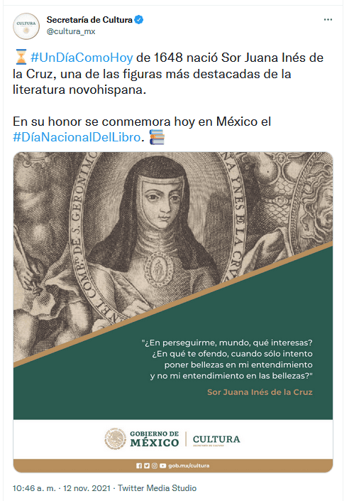 Este 12 de noviembre se celebra el Día Nacional del Libro, una conmemoración cultural que lleva en México más de 40 años, pero, ¿qué tiene que ver con Sor juana Inés de la Cruz?La festividad fue creada el 6 de noviembre de 1979, durante el gobierno del entonces presidente José López Portillo. Nació como un homenaje a Sor Juana, la religiosa y literata de la época novohispana que nació un 12 de noviembre, pero de 1648, y que sea una figura clave de las letras mexicanas por su poesía y teatro. La fecha actual se empezó a utilizar a partir de 1980.Defensora de la educación como un derecho y de la lectura para todo, Sor Juana, popularmente conocida como la "Décima Musa", creció en una época donde la educación estaba reservada exclusivamente a los hombres, por lo que su camino literario fue complicado.La Enciclopedia de la Literatura en México (ELEM) la describe como "la última gran poeta de los Siglos de Oro de la literatura en español", cuya vida intelectual "abarcó todos los saberes de la época. Escribió numerosos poemas líricos, cortesanos y filosóficos, comedias teatrales, obras religiosas y villancicos para las principales catedrales del Virreinato". De estilo barroco, "su poesía es rica en complejas figuras del lenguaje, conceptos ingeniosos y referencias a la mitología grecolatina".Según el decreto de 1979, en el Día Nacional del Libro, los estados, municipios, instituciones educativas y culturales, así como organismos editoriales y gubernamentales, deben realizar y difundir actividades culturales que promuevan el hábito de la buena lectura. También deben brindar el espacio para exaltar la importancia del libro en el desarrollo cultural y educativo en México.OF