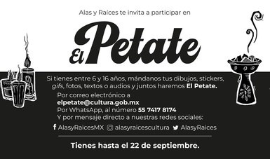 La Secretaría de Cultura federal, a través del programa nacional Alas y Raíces, ha lanzado la invitación a niñas, niños y adolescentes de todo el país, que tengan entre 6 y 16 años de edad, para participar en la cuarta edición de ‘El Petate’, una publicación colectiva impresa y digital que busca dar lugar a la creatividad de quienes deseen compartir mensajes en distintos formatos y composiciones que hagan homenaje o rememoren a personas y seres queridos que ya no están, en el marco de la celebración del Día de Muertos.Así, esta invitación es para que, a través de dibujos, stickers, gifs, fotos, textos o audios, se conforme la edición 2022 de este fanzine, hecho con la participación de las infancias y adolescencias de México, a partir de sus ideas alrededor de una de las tradiciones más arraigadas de nuestro país; de esta forma, las y los interesados podrán participar en una o las cuatro diferentes secciones de ‘El Petate’ de este año:En este sentido, el envío de las participaciones podrá realizarse vía correo electrónico a la dirección elpetate@cultura.gob.mx; o por WhatsApp, al número 55 7417 8174 y por Mensaje Directo (DM), en las redes sociales de Alas y Raíces.La recepción de las creaciones concluye el jueves 22 de septiembre de 2022. Los materiales seleccionados serán publicados en ‘El Petate’, el 31 de octubre; el cual podrá descargarse de manera gratuita en la página web: https://alasyraices.gob.mx/convocatoria-petate2022.pdf.Con programas como ‘El Petate’, la Secretaría de Cultura continúa brindando espacios de expresión donde las opiniones y reflexiones de niñas, niños y adolescentes del país reflejen el ejercicio de sus derechos culturales, fomentando la participación y el desarrollo de la creatividad, para no dejar a nadie atrás.Se sugiere seguir las redes sociales de Alas y Raíces en Facebook (Alas y Raíces MX); Twitter (@AlasyRaices), Instagram y YouTube (@alasyraicescultura); pero también las redes sociales de la Secretaría de Cultura en Twitter (@cultura_mx), Facebook (/SecretariaCulturaMX) e Instagram (@culturamx).MF