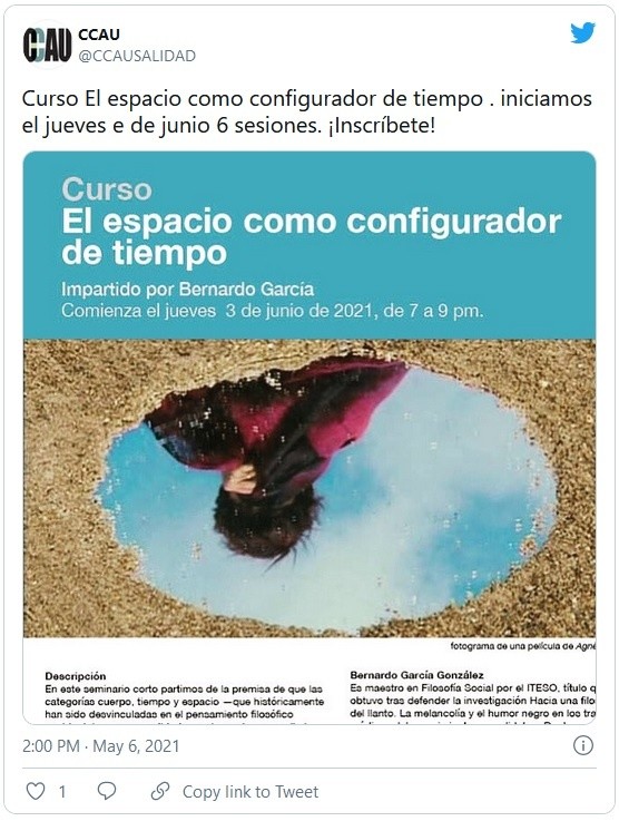 El Centro para la Cultura Arquitectónica y Urbana (CCAU) tendrá el curso "El espacio como configurador de tiempo", impartido por Bernardo García mcon seis sesiones que comenzarán el próximo jueves 3 de junio. El curso propone estudiar la unión entre categorías cuerpo, tiempo y espacio, tres temas que el pensamiento filosófico occidental ha explorado de manera aislada. El seminario plantea un acercamiento a estos temas como “un entramado, una urdimbre que en el ámbito de la experiencia resulta prácticamente indivisible”.En ese contexto, y en concordancia con la temática principal del CCAU, la conversación tomará a la arquitectónica no sólo como un elemento del espacio, sino también como un elemento que nos ayuda a configurar temporalidades y labrar cuerpos.Echando mano del léxico arquitectónico, el curso “propondrá una reflexión que, en lugar de trazar fronteras entre cuerpo, tiempo y espacio, se sitúe en los goznes de esas tres realidades”.Además de este curso, el CCAU alberga diversas actividades alrededor de la arquitectura y urbanismo, desde conferencias, recorridos y proyecciones de cine. Su acervo de conferencias está disponible en línea en su canal de Vimeo (www.vimeo.com/ccau).Bernardo García es maestro en filosofía social, por parte del ITESO. En la misma universidad dirige el Departamento de Formación Humana, además de haber impartido cátedra en materias vinculadas con antropología, epistemología, ética y cine.Del jueves 3 de junio al 8 de julio (19:00 a 21:00 horas). Mayores informes al 331 329 0132 o al correo ccau.info@gmail.com.JM
