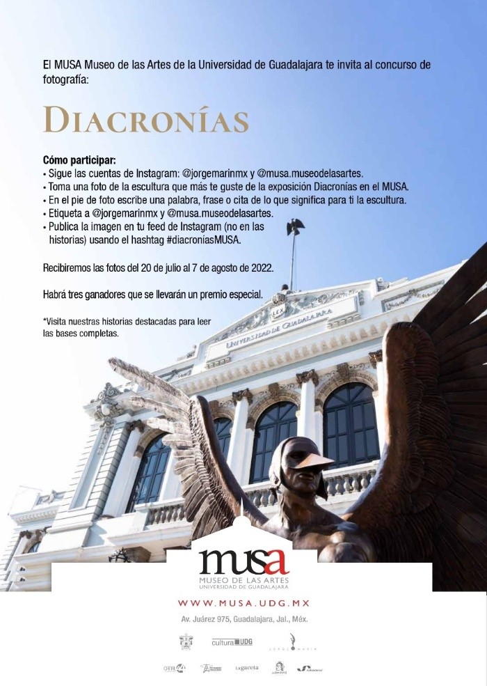 En el marco de la exposición ‘Diacronías’, el Museo de las Artes (MUSA) de la Universidad de Guadalajara (UdeG), en colaboración con el estudio Jorge Marín, llevará a cabo un concurso de fotografía de las esculturas monumentales del artista de origen michoacano que se montaron en derredor del recinto.Esta actividad se realiza a partir del 20 de julio y concluirá el 7 de agosto, y para ser parte de esta hay que seguir las cuentas de Instagram: @jorgemarinmx y @musa.museodelasartes. La foto que se tome de la pieza elegida debe llevar una palabra, frase o cita de lo que significa la escultura para el participante.Luego, hay que etiquetar las cuentas mencionadas y publicar la imagen en el feed con el hashtag #diacroníasMUSA. La elección de tres ganadores estará a cargo de un jurado integrado por personal del MUSA y del estudio Jorge Marín.Por otra parte, la convocatoria completa se encuentra disponible en las redes sociales y el sitio web del museo; y es muy importante que los interesados sigan las instrucciones al pie de la letra, ya que, de no cumplir con todos los puntos especificados, no quedará registrada su participación.Visita las historias destacadas de @musa.museodelasartes para leer las bases completas.MF