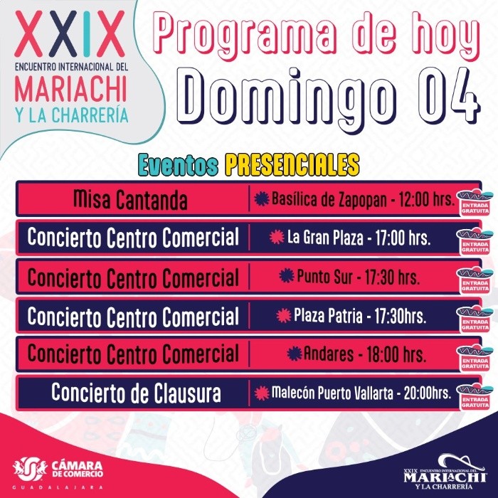 La recta final del XXIX (edición 29) Encuentro Internacional del Mariachi y la Charrería ha comenzado, y tras múltiples funciones públicas y en recintos emblemáticos como el Teatro Degollado y el Conjunto Santander de Artes Escénicas, así como por diversos municipios de Jalisco, el festín musical y cultural está por presentar sus últimas actividades con el impulso de la Cámara de Comercio de Guadalajara.Será este domingo 4 de septiembre cuando el Encuentro Internacional del Mariachi y la Charrería 2022 concluya sus actividades con más funciones, y si deseas aprovechar de disfrutar una vez más de los mejores mariachis de Jalisco y el mundo, pon atención a la ruta de activaciones que se tendrán en diversos espacios de la ciudad tapatía y del gran cierre que se tendrá por la noche en los Arcos de Puerto Vallarta, a las 20:00 horas con una gala única en su tipo.Las actividades este domingo 4 de septiembre darán inicio con una misa cantada en el Basílica de Zapopan, a las 12:00 horas.A las 17:00 horas, habrá un concierto en las instalaciones de la Gran Plaza, a las 17:30 horas también habrá show en el centro comercial Punto Sur y en Plaza Patria, en tanto que a las 18:00 horas la fiesta comenzará en el centro comercial Andares.Para la clausura, los exponentes estelares serán los mariachis Nuevo Tecalitlán y Así es Tecolotlán, que llegarán al malecón de Puerto Vallarta, en sus icónicos Arcos, a partir de las 20:00 horas.Para conocer más detalles de estas actividades puedes acceder al programa general del Encuentro Internacional del Mariachi y la Charrería 2022 en https://www.mariachi-jalisco.com.mx/programa_general.pdf y a través de sus redes sociales Facebook.com/EncuentroMariachi/.JL