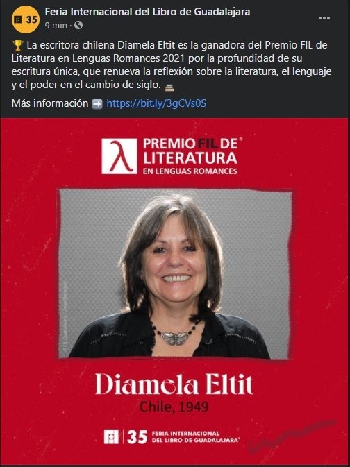 Raúl Padilla López, Presidente ejecutivo del Premio FIL de Literatura y la FIL Guadalajara, y Lorena Amaro Castro —Profesora Titular del Instituto de Estética de la Pontificia Universidad Católica de Chile—, representante del jurado del premio anunciaron que quedó en manos de la escritora chilena Diamela Eltit, autora de obras como “Lumpérica” y “Los vigilantes”. Diamela agradeció al jurado que le otorgaran el galardón, y agregó que fue una grata sorpresa: “fue inesperado y emocionante”, agregó.La autora recibirá el galardón el 27 de noviembre próximoAna Diamela Nadine Eltit Gonzáles, nació en Santiago, 24 de agosto de 1947. En 2018 fue galardonada con el Premio Nacional de Literatura. Aunado al premio FIL ha sido reconocida con:En breve más información...AC