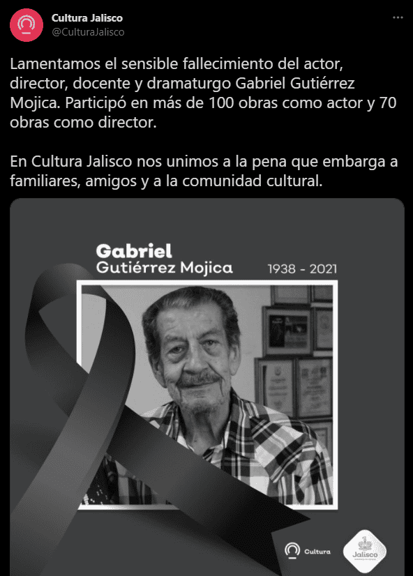 La Secretaría de Cultura de Jalisco dio a conocer el sensible fallecimiento del maestro Gabriel Gutiérrez Mojica, actor, director, docente y dramaturgo con más de 65 años de trayectoria. “Nos unimos a la pena que embarga a familiares, amigos, así como a la comunidad teatral de Jalisco, que aunque hoy lo despide, seguirá presente a través de las generaciones de las que fue maestro y con las que compartió los escenarios”, indicó la dependencia. Nacido en Guadalajara en el año de 1938, Gabriel Gutiérrez dedicó su vida a la actividad teatral desde 1955. Llegó a participar en más de 100 obras como actor y 70 como director. Su entusiasmo como promotor y amante del teatro, lo llevó a desempeñarse en todas las áreas en las que pudo involucrarse, desde la lectura de obras, creación o adaptación de textos, hasta la dirección, actuación, escenografía, iluminación, vestuario, música, publicidad y utilería. El Ex Convento del Carmen fue su casa por 60 años, lugar donde formó varias generaciones de creadores. Además fue profesor por 27 años de Educación Artística (artes plásticas, música y teatro) en la Secretaría de Educación Pública. Fue también asesor de grupos teatrales en distintos municipios de Jalisco y autor de algunos libros didácticos en materia de artes. Su formación académica comenzó con la Licenciatura en Artes Escénicas, en la Universidad de Guadalajara, donde obtuvo también el título “Instructor de Música”, en la Escuela de Música. Además cursó estudios de dirección, tinte y texturización, escenografía, géneros teatrales y arte integral, en el Instituto Nacional de Bellas Artes. En 2010 recibió el Galardón al Mérito Teatral por la Secretaría de Cultura y fue beneficiario en la emisión 2020-2021 del Programa de Estímulo a la Creación y Desarrollo Artístico de Jalisco (PECDA), en la categoría de “Creadores Eméritos”.***Si te interesó esta noticia y quieres saber más, entonces descarga y descubre INFORMAPlus, la aplicación digital de EL INFORMADOR, en donde tenemos contenidos exclusivos, seleccionados por nuestros editores, para darles una experiencia más completa a los lectores.Descarga la aplicación y pruébala GRATIS por treinta días.Para iOS: https://apple.co/35jaVgbPara Android: https://bit.ly/3gwVSEVSi eres suscriptor de EL INFORMADOR tu acceso está incluido, solicítalo al 33 3678-7777
