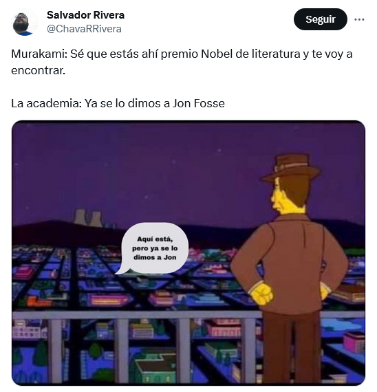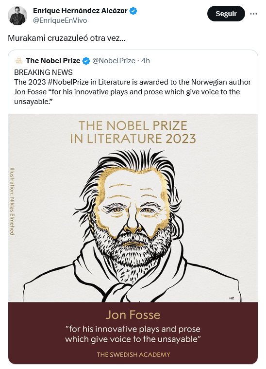 Hoy jueves 5 de octubre se dio a conocer al ganador del Premio Nobel de Literatura 2023. El sueco Jon Fosse resultó el galardonado de la edición de este año "por sus innovadoras obras de teatro y su prosa que dan voz a lo inefable", mientras que otra vez el consentido de muchos, el japonés Haruki Murakami, volvió a quedar descartado del anuncio de la Academia Sueca en Estocolmo.Jon Fosse, explica el comité del premio más prestigioso de las letras en el mundo, ha desarrollado un estilo que ha llegado a conocerse como el "minimalismo de Fosse", que se ve por ejemplo en su segunda novela, "Steng gitar" (1985), en la que hace variaciones sobre sus temas centrales, como el del momento crítico de la indecisión, dice El Universal.Donde Murakami sí triunfó, sin duda, fue en los memes que de inmediato comenzaron a circular en las redes sociales.OF