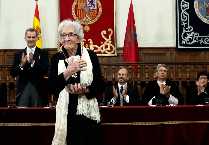La escritora uruguaya Ida Vitale homenajeó este martes el ''frenesí poético'' que alberga la obra cumbre ''El Quijote'' al recibir el Premio Cervantes, el máximo reconocimiento a la creación literaria en español.''Muchas veces lo que llamamos locura de 'El Quijote', podría ser visto como irrupción de un frenesí poético, no subrayado como tal por Cervantes, un novelista que tuvo a la poesía por su principal respeto'', dijo la poeta.Figura destacada del esencialismo poético, Vitale es a sus 95 años la quinta mujer en recibir el galardón. Al anunciarlo, el jurado describió su poesía como ''intelectual y popular, universal y personal, transparente y honda''.Última sobreviviente la llamada Generación del 45, que integraron figuras como Mario Benedetti, Juan Carlos Onetti, Amanda Berenguer y Ángel Rama, su primer marido, Vitale ha compaginado la docencia con la publicación de poesía, prosa y traducciones del francés, inglés, italiano y portugués.Conmemorando la fecha de fallecimiento de Cervantes, el premio dotado con 125 mil euros (140 mil dólares) se entrega cada 23 de abril en la cuna del autor de ''El Quijote'', el Paraninfo de la Universidad de Alcalá de Henares, a 45 kilómetros de Madrid.Acompañada de su familia, Vitale recibió la medalla y la escultura de manos del rey Felipe VI, ante la mirada de la reina, Letizia. ''Ahora no me saldría leer el discurso, sino abrazar y decir cosas absurdas, pero que me saldrían del alma'', dijo la escritora tras subir a lo alto de un atril que se eleva sobre la sala.Después comenzó a leer, y durante más de 15 minutos reflexionó sobre la obra cumbre del Siglo de Oro de la literatura en español.''No sé por qué atribuí a ese libro la capacidad de precipitar hacia mí la buena voluntad del azar'', afirmó la escritora. ''Quizás simplemente buscaba una ocasión de dicha dispersiva, de claridad sin reserva, cuando el disfrute viene sin proponérselo a veces, acompañado de una sensación de penuria de gracias en la vida diaria y necesidad de gusto satisfecho''.Reflexionar sobre la obra cervantina se ha convertido en una tradición por parte de los galardonados desde 1976, que incluyen al nicaragüense Sergio Ramírez (2017) o al barcelonés Eduardo Mendoza (2016), entre los más recientes.Solo cuatro mujeres antes de Vitale habían logrado el reconocimiento: las españolas María Zambrano y Ana María Matute, en 1988 y 2010 respectivamente, la cubana Dulce María Loynaz en 1992 y la mexicana Elena Poniatowska en 2013.Vitale nació en Montevideo y creció en una familia culta, de origen italiano, durante años en los que Uruguay se erigía en remanso de paz y progreso dentro del continente. Pero cuando un golpe militar tomó control del país, la escritora se exilió a México, donde permaneció entre 1974 y 1985 y conoció a figuras literarias como Octavio Paz.Posteriormente, Vitale vivió en Austin, Estados Unidos, y pasó largas temporadas en España, antes de regresar a Uruguay con su segundo marido, el poeta Enrique Fierro, fallecido en 2016.Desde su primera obra, ''La luz de esta memoria'', en 1949, y su afamada ''Palabra dada'', de 1953, hasta el recorrido por sus vivencias mexicanas recogidas el pasado año en ''Shakespeare Palace'', la poesía y prosa de Vitale se ha publicado docenas de libros y antologías.La escritora ha recibido destacados galardones como el Premio Internacional de Poesía y Ensayo Octavio Paz, en 2009, el Premio Reina Sofía de Poesía Iberoamericana, en 2015, y este pasado año fue galardonada con el Premio FIL de la literatura en lenguas romances de la Feria Internacional del Libro de Guadalajara, en México.OF