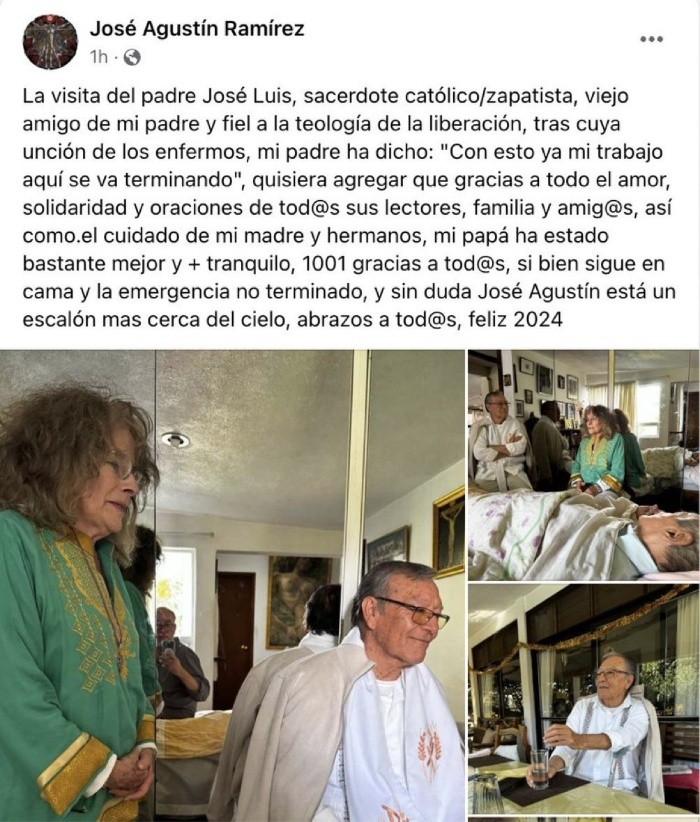 "Con esto ya mi trabajo aquí se va terminando", fueron las palabras del escritor José Agustín tras recibir la unción de los enfermos.Desde su cuenta de Facebook, José Agustín Ramírez, dibujante e hijo más joven del escritor, escribió: "La visita del padre José Luis, sacerdote católico/zapatista, viejo amigo de mi padre y fiel a la teología de la liberación, tras cuya unción de los enfermos, mi padre ha dicho: 'Con esto ya mi trabajo aquí se va terminando', quisiera agregar que gracias a todo el amor, solidaridad y oraciones de tod@s sus lectores, familia y amig@s, así como el cuidado de mi madre y hermanos, mi papá ha estado bastante mejor y más tranquilo, mil y un gracias a tod@s, si bien sigue en cama y la emergencia no termina, y sin duda José Agustín está un escalón más cerca del cielo, abrazos a tod@s, feliz 2024", escribióEl mensaje fue borrado al poco tiempo y en su lugar, se publicó una rectificación hecha por su hijo: "Sólo para aclarar, por si hubo alguna confusión, mi padre sigue vivo y luchando, su familia lo acompañamos y nos sorprende su fuerza, me disculpo si pude dar esa idea, he borrado el post, les agradecemos a todos su apoyo e interés en su salud, seguimos con nuestras oraciones y en nuestro camino. Esta foto es de hace algunas semanas".La unción sucedió después de que el autor de "Cerca del fuego" y "Se está haciendo tarde (final en laguna)" fuera reportado con pronóstico "reservado" el último fin de semana de 2023.Hace 11 años, en 2012, José Agustín sufrió un accidente durante una presentación en Puebla, en la que se rompió el cráneo y dos costillas; tras dicho incidente, el escritor guerrerense que le dio voz a una generación de la literatura mexicana, bautizada como La Onda por Margo Glantz, no volvió a publicar.En 2011, José Agustín ganó el Premio Nacional de Ciencias y Artes, y en 2005, el Mazatlán de Literatura.SV
