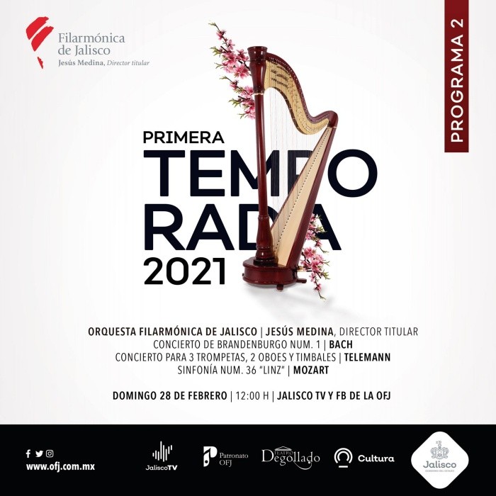 La Secretaría de Cultura de Jalisco, informó a que a partir del domingo 28 de febrero, a las 12:00 horas, la Orquesta Filarmónica de Jalisco de Jalisco (OFJ) presenta su segundo programa en formato digital, con el que inaugura la primera temporada de 2021, bajo la batuta de su director titular Jesús Medina.El segundo programa de esta primera temporada del año, abre con el Concierto de Brandenburgo No. 1 de Bach, donde se disfruta la belleza característica del sonido del corno. Después se escuchará, del prolífico compositor y multi instrumentista barroco George Telemann, el concierto para tres trompetas, timbales y dos oboes.El programa cierra con la Sinfonía Núm. 36 “Linz” de Mozart. Obra que el compositor creó la misma tarde del concierto que tuvo de imprevisto en el poblado homónimo en su camino de regreso a Viena, tras la muerte de su hijo.Durante su temporada, la Orquesta Filarmónica de Jalisco brindará un concierto diferente cada domingo hasta de 28 de marzo.Los conciertos serán transmitidos gratuitamente desde el Teatro Degollado a través de la web de Jalisco TV (jaliscotv.com/), así como vía Facebook: Orquesta Filarmonica de Jaliscojb