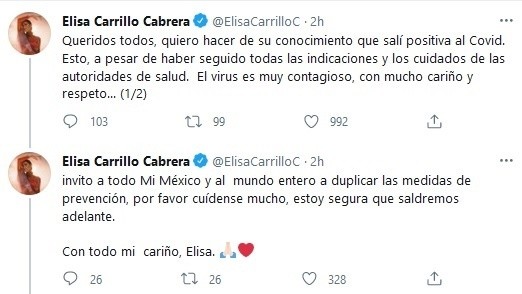 Elisa Carrillo, primera bailarina del Staatsballett Berlin, ganadora del Premio Benois de la Danza 2019, informó en sus redes sociales que dio positivo a COVID-19, e hizo un llamado a continuar con las medidas sanitarias."Queridos todos, quiero hacer de su conocimiento que salí positiva al COVID. Esto, a pesar de haber seguido todas las indicaciones y los cuidados de las autoridades de salud", dijo la también codirectora artística de la Compañía Nacional de Danza de México.Carrillo, añadió: "El virus es muy contagioso y con mucho cariño y respeto invito a todo mi México y al mundo entero a duplicar las medidas de prevención. Por favor cuídense mucho. Estoy segura que saldremos adelante".Carrillo ha recibido cientos de mensajes de apoyo y deseos de pronta recuperación, los cuales agradeció.La bailarina es embajadora de la Cultura de México, miembro del Consejo Internacional de Danza en la UNESCO, miembro del Consejo Diplomacia Cultural en México, presidenta del Consejo de la Fundación Elisa Carrillo Cabrera AC, directora artística de la Fundación Sir Anton Dolin y maestra de Ballet grado otorgado por el Ministerio de Cultura en Alemania y por la John Cranko Schule Stuttgart.jb