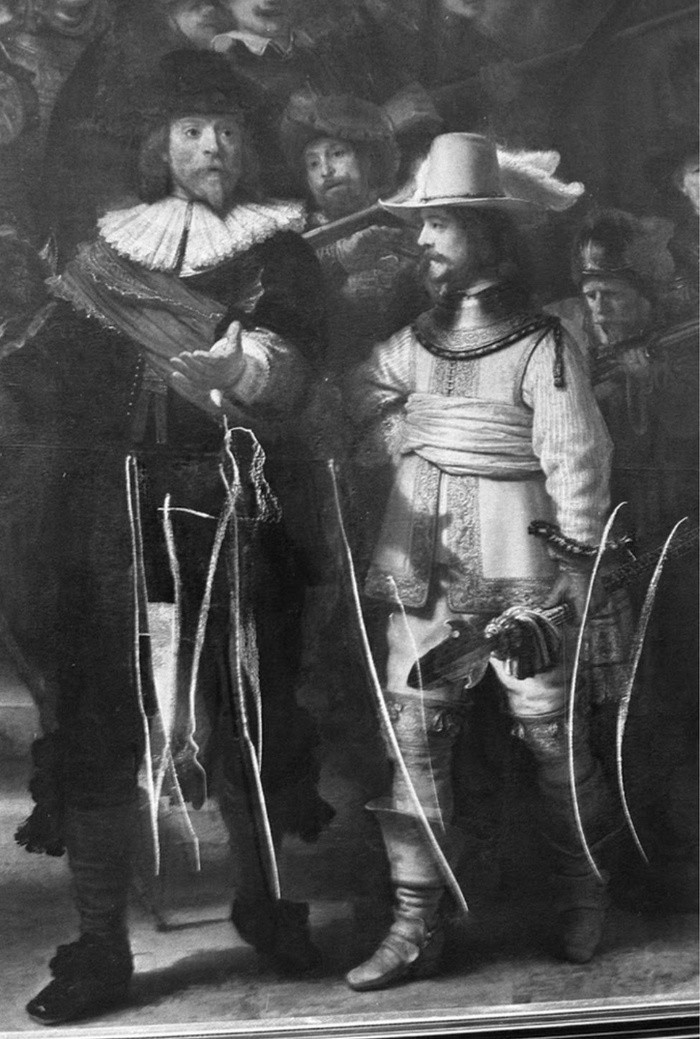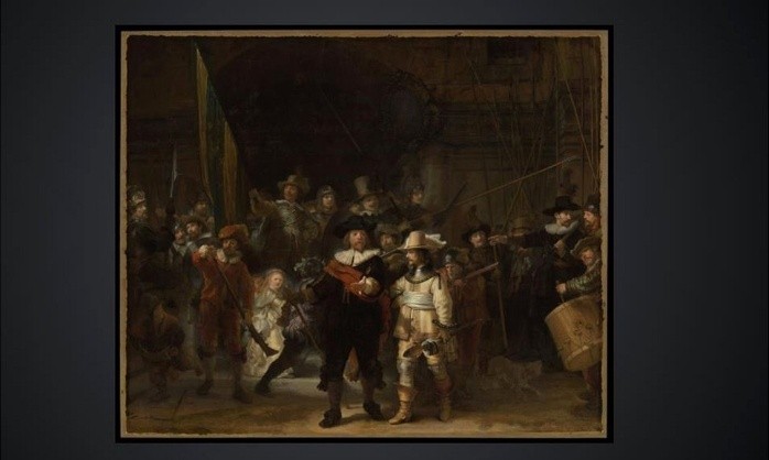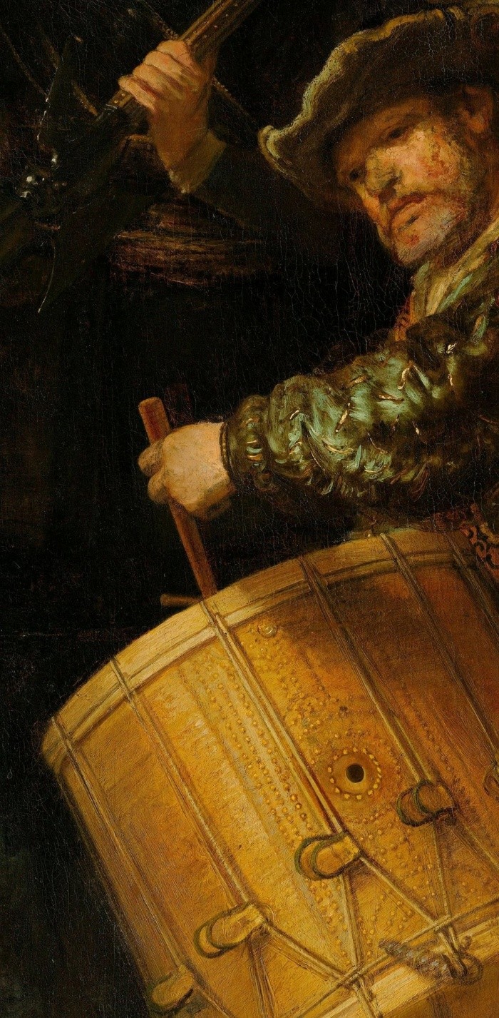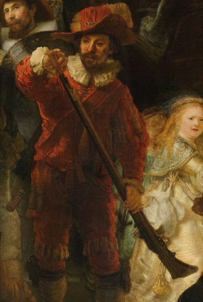 A las 9 de la mañana del martes 12 de mayo el Rijksmuseum en Amsterdam, Holanda, publicó en su sitio web una imagen de "La Ronda Nocturna" (1642) de Rembrandt.Quizás estás pensando que eso no tiene nada de raro. Después de todo, el museo frecuentemente publica obras maestras de la Edad de Oro neerlandesa. Pero hay algo sobre esta fotografía en particular que la hace sobresalir.La imagen presenta la obra sin enmarcar con un trasfondo gris oscuro. Se ve clara y bien iluminada pero no parece excepcional... hasta que haces clic.Inmediatamente, la imagen se agranda y ves más detalles.Si haces clic otra vez, te propulsa hacia la mano estirada del capitán Frans Banninck Cocq. Otro clic y te encuentras cara a cara con el líder del grupo de hombres algo molestos.Un clic más, y puedes ver el brillo en su ojo y la textura de su barba pelirroja.En ningún momento la imagen se desvirtúa ni se distorsiona.A medida que sigues haciendo clics, te vas metiendo cada vez más en la obra hasta que ese ojo del capitán queda del tamaño de un puño y te das cuenta de que ese pequeñísimo brillo que viste antes no es resultado de una pincelada de Rembrandt, sino de cuatro aplicaciones separadas de pintura, cada una cargada con un tono de pintura ligeramente diferente.Ni siquiera entonces la imagen virtual de la gran obra pierde su nitidez.Entonces te detienes y piensas: "¡Caramba! A pesar de que probablemente nadie iba a ser capaz de notarlo, Rembrandt usó cuatro colores diferentes para pintar un minúsculo efecto de luz en el ojo de uno de muchos personajes de tamaño real representados en este retrato de grupo".Quizás este visionario holandés del siglo XVII previó un futuro en el que los primeros experimentos con técnicas de cámara obscura, los que quizás probó, eventualmente llevarían a una tecnología fotográfica capaz de registrar la representación visual de su gigante lienzo a un nivel de detalle más fino que el que el mismo artista podía ver.Por ejemplo, siempre me ha gustado el perro fantasmal que se voltea y le gruñe al tamborilero que está en la orilla de la pintura. Yo había asumido que el sabueso no estaba terminado y por lo tanto no había sido querido por Rembrandt. Pero ahora puedo ver, al acercarme, que el artista no sólo le puso un elegante collar, sino que le añadió un pendiente de oro con un pequeñísimo destello de pintura roja para hacer eco del color de los pantalones del tamborilero.Es claro que a Rembrandt le gustaban los perros.Como siempre, hay artificio detrás del arte, como verás a los pocos minutos de acercarte a "La Ronda Nocturna".Rápidamente se hace evidente que Rembrandt primero creó su composición maravillosamente dinámica, y luego la afinó a medida que avanzaba. Verás que hizo muchas pequeñas correcciones sombrías (pentimenti), como la parte superior de la baqueta del baterista en el extremo derecho, o en el dedo índice del alférez que sostiene la bandera de la tropa en alto.También hay artificio en la fotografía del Rijksmuseum. No es una sola imagen como parece, sino un compuesto de 528 fotografías digitales individuales unidas a la perfección para darnos una visión completamente nueva de una de las pinturas más famosas del arte occidental.Reversemos los clics y volvamos por un momento a la escena completa.Tras firmar y fechar la obra, Rembrandt la nombró: "La compañía militar del capitán Frans Banninck Cocq y el teniente Willem van Ruytenburgh".Fue un retrato comisionado por la Compañía Militar de Arcabuceros para colgarlo en su sede.Quienes aparecen en él (unos 18 miembros originalmente) pagaron para que se les incluyera. El capitán Cocq está en el centro con su confiable teniente Willem van Ruytenburch a su lado. Los hombres reunidos detrás de ellos llevan una variedad de armas para defenderse su vecindario.Los arcabuces (mosquetes) eran su especialidad, un punto que Rembrandt ilustra con una secuencia surreal que va de izquierda a derecha en la pintura representando a tres mosqueteros. El primero, vestido de rojo con cuello y puños blancos, está cargando su mosquete con pólvora. El segundo, un joven parcialmente oscurecido por el brazo derecho de Cocq, dispara su arma, desordenándole las plumas al sombrero de Ruytenburch, pero sin tocarlo a él. Y el tercero, un viejo también vestido de rojo, sopla los restos de pólvora del arma disparada.La niña con el vestido dorado no es miembro de la milicia, pero está allí como una brillante mascota simbólica. Las patas del pollo muerto que cuelgan de su cinturón representan el emblema de los Arcabuces.La pintura estuvo colgada al principio junto a varios retratos de grupo enormes, lo que le daba a quienes visitaban la sede de los guardias una sensación de estar rodeados por hombres fuertes locales.Posteriormente fue llevada en 1715 al Ayuntamiento en la Plaza Dam (ahora el Palacio Real), donde le tuvieron que cortar un poco a cada uno de sus cuatro lados para que cupiera por la puerta.La primera vez que la llamaron "La Ronda Nocturna" fue en 1897, pues el barniz que protegía la pintura estaba tan viejo y manchado que hacía parecer que era una escena nocturna.Esa capa de barniz fue retirada hace mucho en una de las 25 o más restauraciones y tratamientos a los que la obra ha sido sometida a lo largo de los años.La más memorable fue en 1975 después de que un visitante en el museo atacó la pintura con un cuchillo causando daños graves, cuyos rastros puedes ver cuando te acercas en la nueva fotografía compuesta.Ese es precisamente el principal propósito de la foto digital del Rijksmuseum: lanzarte en una misión detectivesca.La imagen de 44,8 gigapixeles fue creada por el departamento de conservación del Rijksmuseum, que actualmente está llevando a cabo la que quizás es la mayor renovación a la que "La Ronda Nocturna" ha sido sometida.Su altísima definición le permite al equipo de 12 especialistas examinar el cuadro sin necesidad de usar microscopi