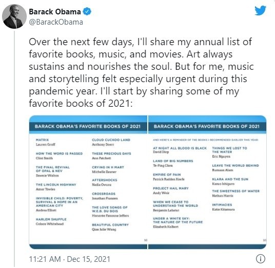 Kazuo Ishiguro, Nathan Harris, Katie Kitamura, Elizabeth Kolbert, Nadia Owusu, Ann Patchett, Lauren Groff y Clint Smith son algunos de los autores de los 24 libros que leyó en 2021 el expresidente estadounidense Barack Obama.El exmandatario estadounidense compartió listas con las que consideró como las mejores películas, la mejor música y los mejores libros de 2021. En el caso de los libros, incluyó "Matrix", de Lauren Groff; "Cloud Cuckoo Land", de Anthony Doerr; "Klara And The Sun", de Kazuo Ishiguro; "Intimacies", de Katie Kitamura; "When We Cease To Understand The World", de Banjamín Labatut.Junto con su reflexión, compartió la lista con los 24 libros que más le habían gustado durante este año que está por terminar. Entre ellos "Klara And The Sun" ("Klara y el Sol"), de Kazuo Ishiguro, la primera novela del escritor luego de recibir el Premio Nobel de Literatura.“Klara es una AA, una Amiga Artificial, especializada en el cuidado de niños. Pasa sus días en una tienda, esperando a que alguien la adquiera y se la lleve a una casa, un hogar. Mientras espera, contempla el exterior desde el escaparate. Observa a los transeúntes, sus actitudes, sus gestos, su modo de caminar, y es testigo de algunos episodios que no acaba de entender, como una extraña pelea entre dos taxistas. Klara es una AA singular, es más observadora y más dada a hacerse preguntas que la mayoría de sus congéneres. Y, como sus compañeros, necesita del Sol para alimentarse, para cargarse de energía…", reseñó Anagrama, editorial que publica el libro de Ishiguro en español.En la lista de Obama también figura "When We Cease to Understand the World", libro que originalmente fue escrito en español por Benjamín Labatut y titulado "Un verdor terrible", en el que "las narraciones incluidas en este libro singular y fascinante tienen un hilo conductor que las entrelaza: la ciencia, con sus búsquedas, tentativas, experimentos e hipótesis, y los cambios que –para bien y para mal– introduce en el mundo y en nuestra visión de él", indicó la editorial Anagrama.Otro libro resaltado por el expresidente de los Estados Unidos fue "Under a White Sky: The Nature Of the Future", de Elizabeth Kolbert, que en México fue traducido como "Bajo un cielo blanco" y publicado por Editorial Crítica.“En 'Bajo un cielo blanco' Elizabeth Kolbert analiza detenidamente el nuevo mundo que estamos creando y, en el camino, se encuentra con biólogos que están tratando de preservar el pez más raro del mundo, que vive en una pequeña piscina en medio del desierto de Mojave; ingenieros que están convirtiendo las emisiones de carbono en piedra en Islandia; investigadores australianos que están tratando de desarrollar un súper coral que pueda sobrevivir en un globo más caliente; y físicos que están contemplando la posibilidad de lanzar pequeños diamantes a la estratosfera para enfriar la tierra, cambiando el color del cielo de azul a blanco", reseñó la editorial.También figura "Crossroads", de Jonathan Franzen. En español lleva el nombre de "Encrucijadas", publicado por Salamandra. Narra una "historia excepcional sobre la vida de una familia americana de los años setenta"."Russ Hildebrandt, pastor en una iglesia progresista de un barrio residencial, está a punto de liberarse de un matrimonio que considera desdichado, salvo que su esposa, Marion, que también tiene sus secretos, se le anticipe. Clem, el primogénito, viene de la universidad infundido de un moralismo extremo que lo ha hecho tomar una decisión que causará estragos. Su hermana Becky, hasta entonces la reina de su clase en el instituto, ha virado bruscamente hacia la contracultura. El tercer hijo, el brillante Perry, que se ha dedicado a vender droga a sus compañeros de curso, se ha propuesto volverse mejor persona. Mientras que el más pequeño, Jay, intenta abrirse camino entre la incertidumbre y el asombro. Así, todos los Hildebrandt persiguen una libertad que los demás miembros de la familia, cada uno por su cuenta, amenazan con coartar", es tan solo una parte de la historia.Otro libro es "Cloud Cuckoo Land", de Anthony Doerr. El libro que en México fue titulado como "Ciudad de las nubes" y editado por SUMA, narra la historia de dos "jóvenes héroes" que "intentan entender el mundo que los rodea. Anna y Omeir se encuentran en lados opuestos de las magníficas murallas de Constantinopla durante el asedio de la ciudad en 1453; el idealista Seymour está inmerso en un atentado contra una biblioteca en una pequeña ciudad de Idaho en la actualidad, y, en un futuro no muy lejano, Konstance viaja a bordo de una nave interestelar que se dirige a un nuevo planeta. Todos ellos son soñadores que encuentran fuerza y esperanza en la adversidad... y todos están unidos por un libro escrito en la antigua Grecia que narra un viaje excepcional".AF