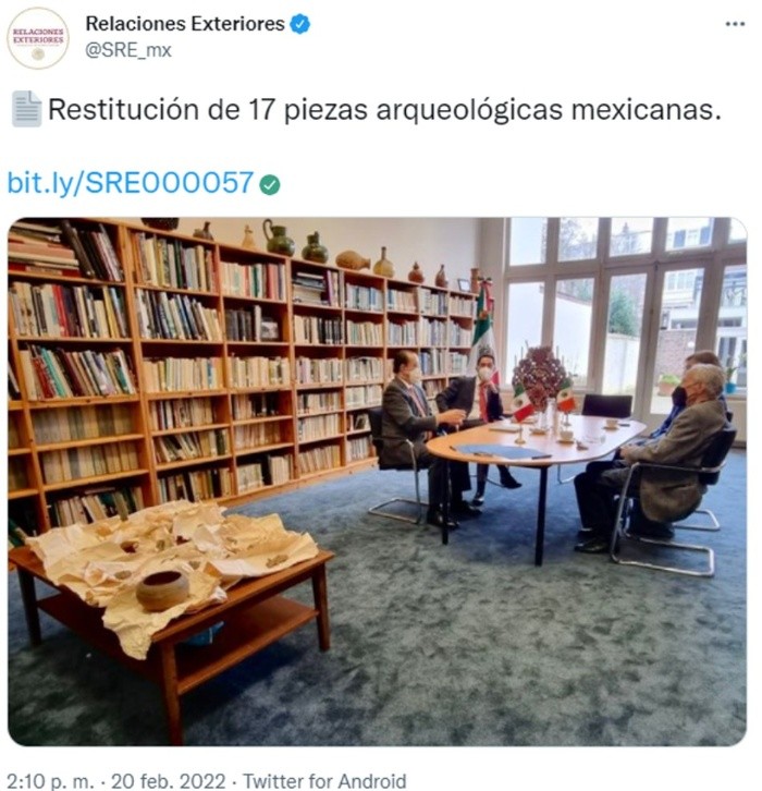 El Gobierno mexicano, a través de la Secretaría de Relaciones Exteriores (SRE) anunció ayer domingo 20 de febrero que recuperó 17 piezas patrimoniales del milenario pueblo indígena huasteco, las cuales se encontraban en Países Bajos."La Embajada de México en los Países Bajos recuperó 17 piezas arqueológicas de México, en su mayoría, originarias de la cultura huasteca y que serán entregadas al Instituto Nacional de Antropología e Historia (INAH)", dio a conocer la Cancillería en sus redes sociales.Los objetos recuperados son artesanías del pueblo huasteco, que tuvo su apogeo en el periodo del posclásico (900-1521 d.C.) en el territorio que hoy comprende los estados de Veracruz, San Luis Potosí, Hidalgo, Tamaulipas, Querétaro y Puebla, en el centro-oriente de México.La SRE no detalló quién poseía las piezas ni sus características, pero se trata de artesanías que representan a pobladores de la época y una vasija característica del pueblo. "Se recuperan 17 piezas que forman parte de nuestro patrimonio arqueológico. ¡Felicitaciones al embajador (José) Zabalgoitia y su equipo!", expresó el canciller mexicano Marcelo Ebrard también en Twitter.El Gobierno de México recuperó del extranjero más de cinco mil 700 piezas que considera patrimonio nacional durante los primeros tres años de la presidencia de Andrés Manuel López Obrador (AMLO), quien ha priorizado esta acción desde que asumió en diciembre de 2018.La SRE, la Fiscalía General de la República (FGR), la Secretaría de Cultura, las embajadas y el INAH han intensificado demandas ante gobiernos extranjeros para recuperar piezas arqueológicas y artísticas.Aunque no siempre con éxito, el Gobierno ha combatido subastas en ciudades como Nueva York, París y Roma en las que aparecen objetos robados o que pertenecen al patrimonio de México.Apenas la semana pasada, la secretaria de Cultura, Alejandra Frausto, y la esposa de López Obrador, Beatriz Gutiérrez Müller, pidieron detener una subasta de la casa Binoche et Giquello de París, donde ofrecía una estatuilla mexicana del periodo preclásico (1150-600 a.C.). OF