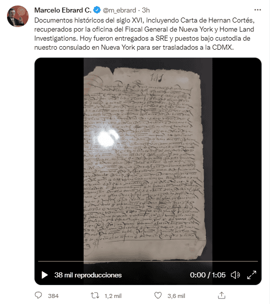México recuperó este jueves en Nueva York varios objetos arqueológicos y documentos históricos del siglo XVI, entre los que se encuentra una carta de Hernán Cortés y un decreto de la Reina Isabel, que fueron calificados por el canciller Marcelo Ebrard como "muy antiguos y muy importantes para la historia de México"."Documentos históricos del siglo XVI, incluyendo Carta de Hernán Cortés, recuperados por la oficina del Fiscal General de Nueva York y Home Land Investigations. Hoy fueron entregados al Secretario de Relaciones Exteriores y puestos bajo custodia de nuestro consulado en Nueva York para ser trasladados a la Ciudad de México", escribió Ebrard en su perfil de Twitter (@m_ebrard). Ebrard acompañó su mensaje con un breve video en el que se muestran los textos, entre los que también se encuentra un decreto real de la Reina Isabel de 1529 y varios objetos y figuras arqueológicas que habían sido robadas del Archivo Nacional de México y vendidas ilegalmente.El ayudante del fiscal del distrito neoyorquino de Manhattan Nitin Savur, que se encargó de entregar los objetos al jefe de la diplomacia mexicana, describió a Hernán Cortés como un "infame conquistador español"."Hoy, una semana después del Día de la Independencia de México, tenemos el honor de devolver 15 piezas asociadas al infame conquistador español Hernán Cortés al pueblo de México, incluido un decreto real firmado por la Reina de España en 1529 que autoriza el regreso de Cortés a las colonias", aseguró Nitin Savur, citado en un comunicado. Según la Fiscalía neoyorquina, se trata de documentos y piezas arqueológicos de una colección "de valor incalculable" que tras su robo en México aparecieron en numerosas galerías de arte y casas de subastas.Savur apuntó que su recuperación fue el resultado de los esfuerzos entre la Unidad de contra el Tráfico de Antigüedades de Estados Unidos y las autoridades mexicanas."Estos elementos emblemáticos del patrimonio cultural, que muestran la evolución del estado español en América Latina y las raíces de la identidad nacional mexicana, regresan a casa, donde serán estudiados y atesorados para las generaciones venideras", subrayó el ayudante del fiscal.¿Quieres saber más?Si quieres tener más contenido, más imágenes y aún más noticias, entonces descarga INFORMAPlus, la aplicación digital de EL INFORMADOR, donde tenemos materiales exclusivos para ti. Descarga la aplicación y pruébala GRATIS por treinta días. Para iOS: https://apple.co/35jaVgbPara Android: https://bit.ly/3gwVSEV Si eres suscriptor de EL INFORMADOR tu acceso está incluido, solicítalo al 33 3678-7777 AA