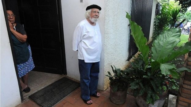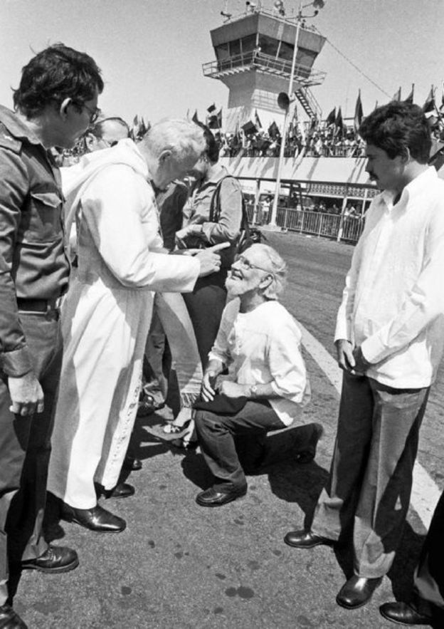 La poesía ya había hecho de Ernesto Cardenal una figura de renombre internacional cuando una fotografía cimentó el estatus icónico del sacerdote nicaragüense, que falleció en Managua este domingo a los 95 años.En la imagen se lo ve con su inconfundible barba y cotona blancas, arrodillado ante el papa Juan Pablo II y esbozando una leve sonrisa, su eterna boina negra reposando humildemente en una de sus rodillas.El Papa, con gesto adusto y un dedo acusador, lo amonesta públicamente frente a sus colegas del gobierno de Nicaragua, congregados ese 4 de marzo de 1983 en el aeropuerto de Managua para recibir al pontífice."Usted debe regularizar su situación", fue el regaño público de Juan Pablo II durante su primera visita a tierras centroamericanas."Como no contesté nada, volvió a repetir la brusca admonición. Mientras, enfocaban todas las cámaras del mundo", contaría luego el poeta y sacerdote en su autobiografía. La escena fue la manifestación más pública del conflicto entre Cardenal y la jerarquía católica por causa de su compromiso con la revolución sandinista (1979-1990), durante la que se desempeñó como ministro de Cultura.Como uno de los más reconocidos exponentes de la teología de la liberación, el autor de El evangelio de Solentiname era una figura destacada de la feroz batalla entre el movimiento y Juan Pablo II, quien prohibió que los sacerdotes ejercieran puestos de gobierno.Pocos meses después, el papa polaco ordenaría la suspensión a divinis de Cardenal, lo que le impidió el ejercicio del sacerdocio por casi 35 años, hasta su revocación, en febrero de 2019, por el papa Francisco.La noticia de esa revocación le llegó mientras convalecía en un hospital de Managua, cada vez más alejado del partido sandinista y de su líder, Daniel Ortega, el hombre de gafas vestido de militar que aparece al lado de Juan Pablo II en la célebre fotografía.Cardenal recibió la noticia tal como había vivido: con la serenidad de haberse mantenido fiel a los valores que lo llevaron a renunciar a los privilegios que le garantizaba su cuna para abrazar el sacerdocio, la causa revolucionaria y la poesía."Mi poesía tiene un compromiso social y político, mejor dicho, revolucionario. He sido poeta, sacerdote y revolucionario", se definió en 2012, al ser reconocido con el Premio Iberoamericano de Poesía Reina Sofía.Nacido el 20 de enero de 1925 en Granada, en el seno de "una de las familias más respetables del país", el futuro sacerdote creció en una de las casonas más emblemáticas de la capital conservadora de Nicaragua."No era un palacio, pero sí el segundo edificio más elegante de Granada", es la descripción de "La Casa de los Leones" que hace en su autobiografía."El primero era la casa de mi abuelo, frente a la plaza central, junto a la catedral", apunta a continuación el poeta, quien describe a ese abuelo como un simple "comerciante rico".Para él la familia Cardenal Martínez había elegido la carrera de derecho.Pero su padre eventualmente se rindió a la evidente vocación literaria del enamoradizo muchacho y le permitió cursar estudios de literatura en México y EE.UU.Otra vocación igual o más fuerte, sin embargo, lo llevaría a ingresar en 1957 en el monasterio trapense de Gethsemani, en Kentucky (EE.UU.), espoleado por el final de uno de esos "muchos enamoramientos" que inspiraron sus famosos Epigramas."Yo no me iba a saciar con nadie, sólo con Dios -cosa que Dios sabía, pero yo no sabía", dice en el primer tomo de sus memorias, Vida perdida, sobre la tensión entre amor romántico y vocación religiosa que lo atormentó durante la primera parte de su vida.Poco después de llegar al monasterio les describió así la jornada a sus padres y hermanos: "¡No pueden imaginarse que viaje más feliz! Hagan de cuenta exactamente un viaje de bodas".En Gethsemani, el poeta nicaragüense conocería además a la mayor influencia política y religiosa de su vida."Tendrá de maestro de novicios a uno que también es poeta, en cierto sentido, y estudió como usted en la Universidad de Columbia", le habían anticipado ya en su carta de admisión, sin nombrar directamente al escritor y místico estadounidense Thomas Merton."Yo había leído prácticamente todos sus libros, e incluso traducido", cuenta de él Cardenal, para luego destacar que Merton solo había sido nombrado maestro de novicios aproximadamente un año antes de su llegada."Y eso lo atribuí a una acción especial de Dios para mí", dice del hombre que lo colocó sobre la ruta de un cristianismo comprometido políticamente y también inspiró la fundación, varios años más tarde, de la Comunidad de Nuestra Señora de Solentiname, en el archipiélago nicaragüense del mismo nombre.El paso de Cardenal por la Orden de la Trapa también lo ayudó a desarrollar su inconfundible estilo literario, que para entonces ya incluía el poema épico Hora 0, que no dejaba dudas de su aversión a las dictaduras de derecha latinoamericanas y en especial a la de su Nicaragua natal, la de los Somoza."Aunque no esté escribiendo poesía, el trabajo manual, que incluye limpiar inodoros, es una práctica de estilo, porque la humildad y sencillez de estos trabajos seguramente perfeccionará mi estilo literario, dándome más sencillez, claridad, expresión directa", escribió.Ese estilo sería también la marca de la comunidad de artistas primitivistas de Solentiname, fundada por Cardenal en 1966, un año después de su ordenamiento como sacerdote, que se convirtió rápidamente en un santuario para los guerrilleros del Frente Sandinista que luchaban contra la dinastía somocista."Al principio le había dicho a los líderes guerrilleros que estaba de acuerdo con sus metas pero no con sus métodos, pero ante la dictadura de Somoza, la única vía posible era la lucha armada", le dijo Cardenal a BBC Mundo en 2007.Luego del triunfo de la revolución en julio de 1979, Cardenal trató de replicar lo hecho en Solenti
